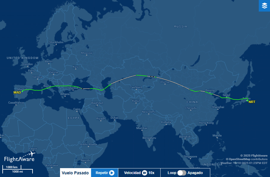 El pasado 16 de octubre viajé de nuevo a Tokio, así que pude experimentar de primera mano las implicaciones de las restricciones aéreas. El trayecto de ida tuvo que evitar por completo Rusia, así que se puede ver cómo el piloto optó por latitudes más al sur, sobrevolando el Cáucaso, Kazajistán y China, hasta llegar a Japón.