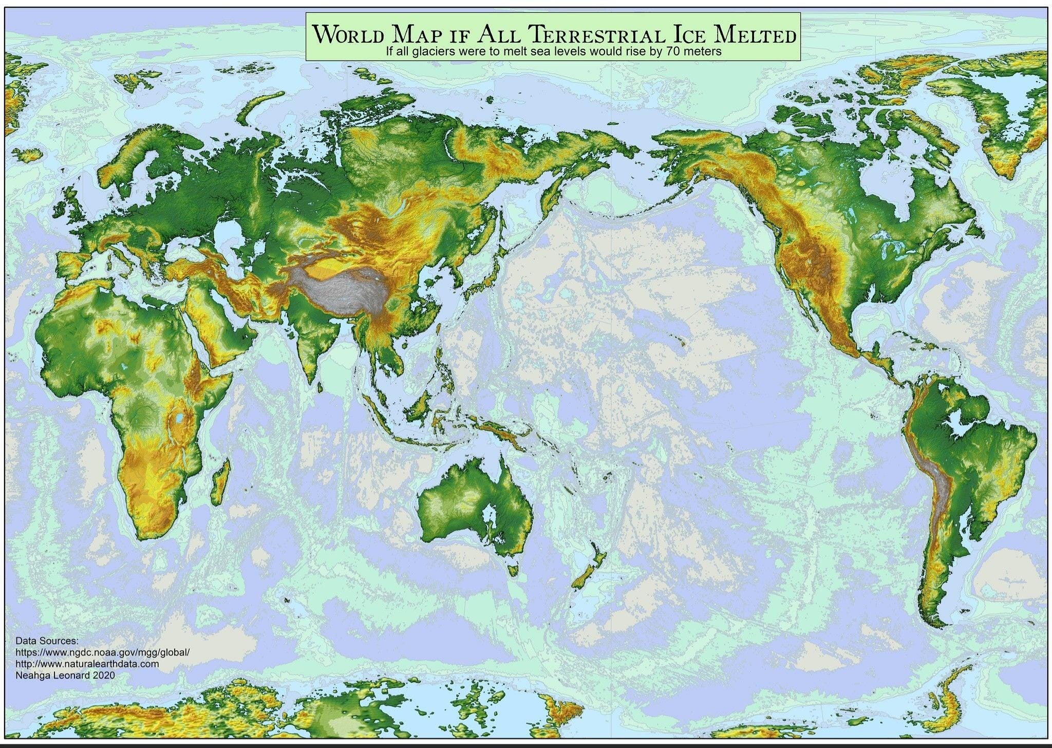 ¿Y qué pasaría si desapareciera todo ese hielo permanente que se almacena en la Antártida, en Groenlandia y en las cumbres elevadas? Pues el nivel del mar se elevaría unos 70 metros sobre su situación actual, lo que dejaría sin casa a aproximadamente el 40 % de la población mundial que vive en costas y en llanuras agrícolas a pocos metros de elevación. Consecuentemente, la forma de las costas también cambiaría.