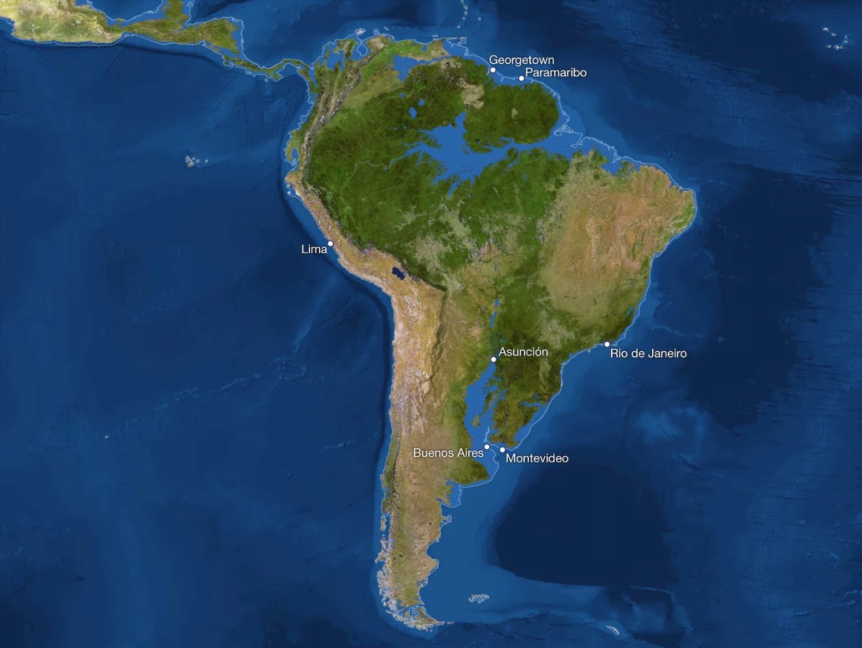 La mayor cantidad de nuevos mares interiores aparecería en Sudamérica. Las cuencas de los ríos Orinoco, Amazonas y Paraguay se inundarían por completo, creando una costa este extremadamente sinuosa. Por muy poco, el mar del Amazonas y el mar del Orinoco, lo que hubiera hecho de las Guayanas una de las islas más grandes del mundo.