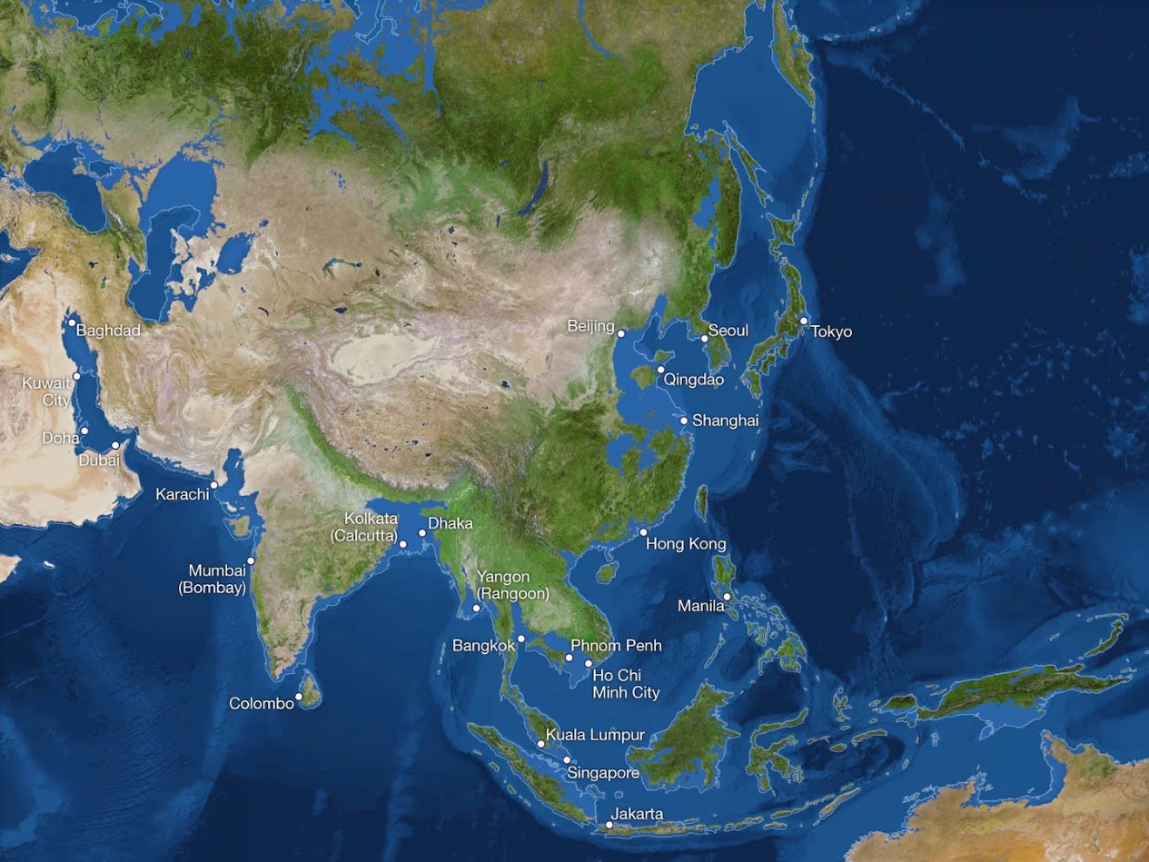 Asia sería el continente que tendría más población afectada, con más de 2.000 millones de personas viviendo por debajo de los 70 metros de altitud. La gran cantidad de estos desplazamientos tendría lugar en China, en India, en el Sudeste Asiático y en Bangladés, que desaparecería por completo. Del mismo modo, sería el final de la mayoría de las grandes ciudades del mundo: Tokio, Shanghái, Pekín, Bombay, Calcuta, Bangkok, Seúl, Bagdad u Ho Chi Minh serían historia.