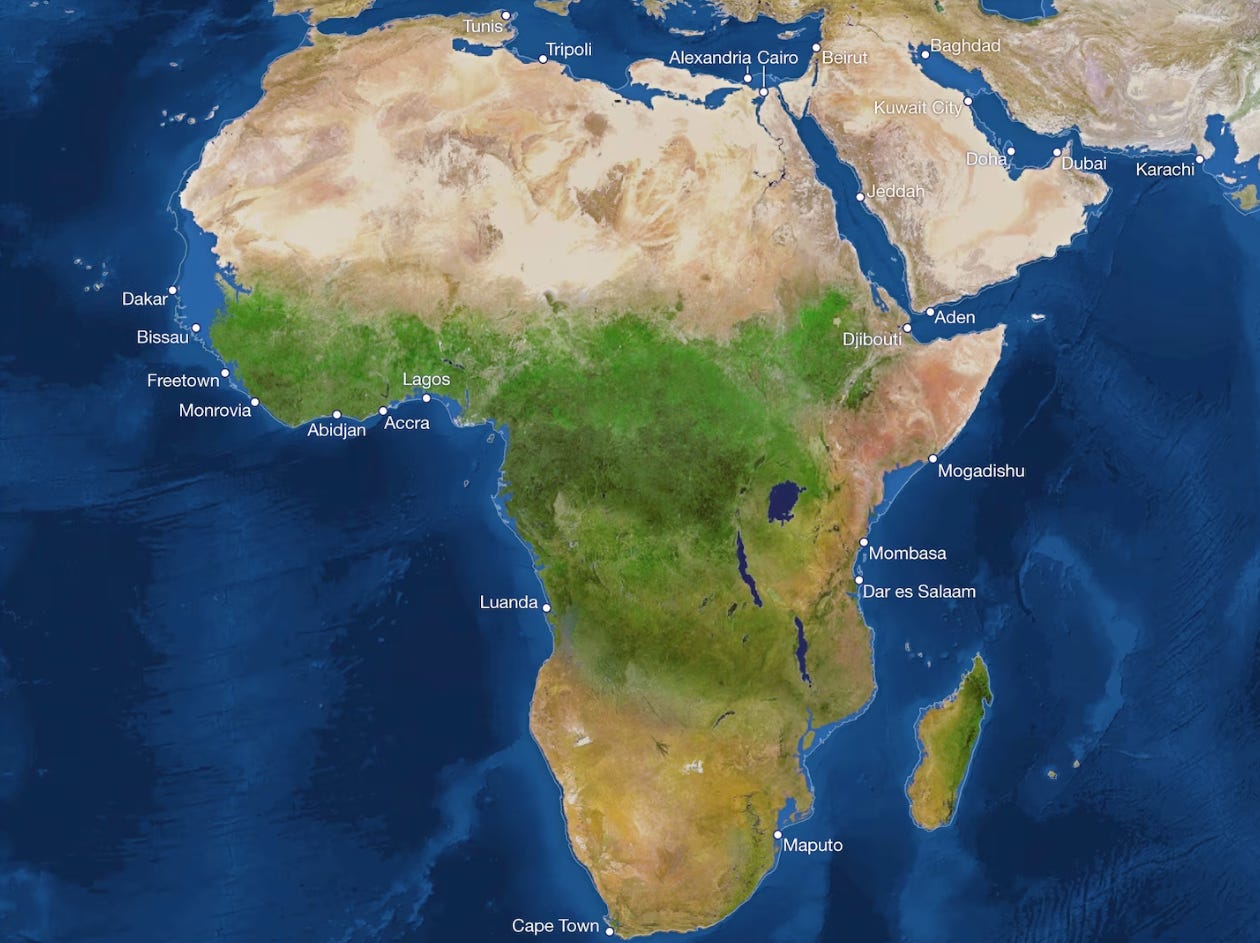 África es uno de los continentes que mantendría su costa más o menos semejante a la actual. El mayor impacto tendría lugar en Egipto, ya que la desaparición del delta del Nilo y la inundación de gran parte de su cauce forzarían el desplazamiento de gran parte de los 100 millones de habitantes del país. Las zonas costeras de Nigeria, Senegal o Sudáfrica también desaparecerían, y con ellas Dakar, Lagos o Ciudad del Cabo, donde la montaña de la Mesa volvería a estar en la costa.